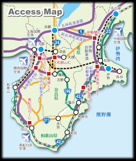 JRでは・・・・・●名古屋駅から特急「ワイドビュー南紀号」で熊野市駅まで約3時間 ●新大阪駅から特急「特急くろしお号」で新宮駅まで約4時間 新宮駅から普通列車で熊野市駅まで20分 お車では・・・・・ ●名古屋駅から東名阪自動車道→紀勢自動車道 紀伊長島ICー尾鷲北ICー国道42号ー尾鷲南ICー熊野大泊ICまで ※鬼ケ城は、熊野大泊IC出口から約1分です。 ●大阪から西名阪自動車道(柏原IC)→R165→大和高田→R24→橿原→R169号→R309→R42号経由にて熊野市まで約3時間(約140km) ※交通事情等により変更が生じる場合があります。